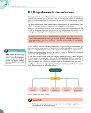 El documento describe las funciones del departamento de recursos humanos en una empresa. Estas incluyen la organización del departamento, la selección y formación de empleados, la administración de nóminas y contratos, el diseño de sistemas de retribución, el desarrollo de los empleados a través de formación, y la gestión de las relaciones laborales y servicios sociales para los empleados. El departamento se organiza en función del tamaño de la empresa y puede incluir secciones para cada una de estas funciones.