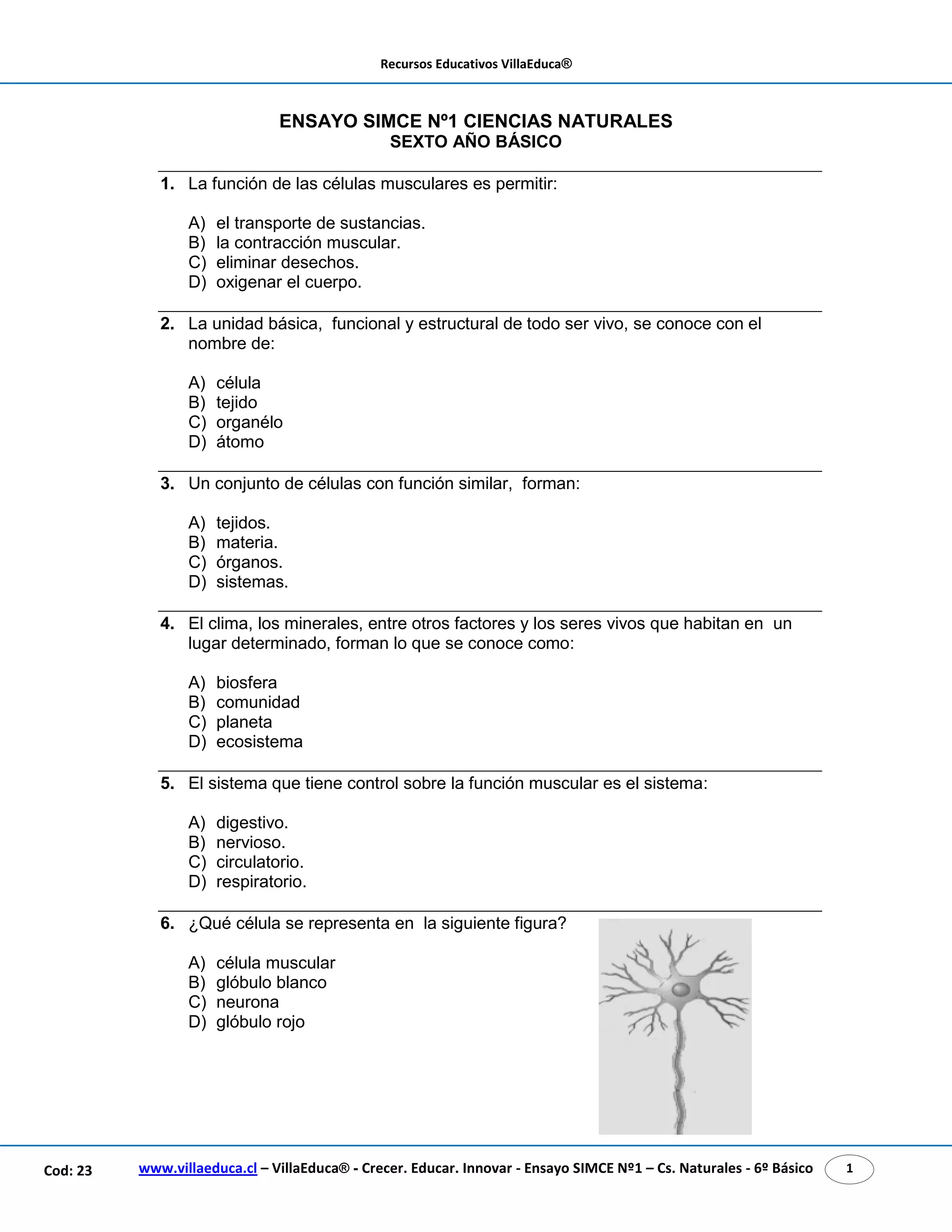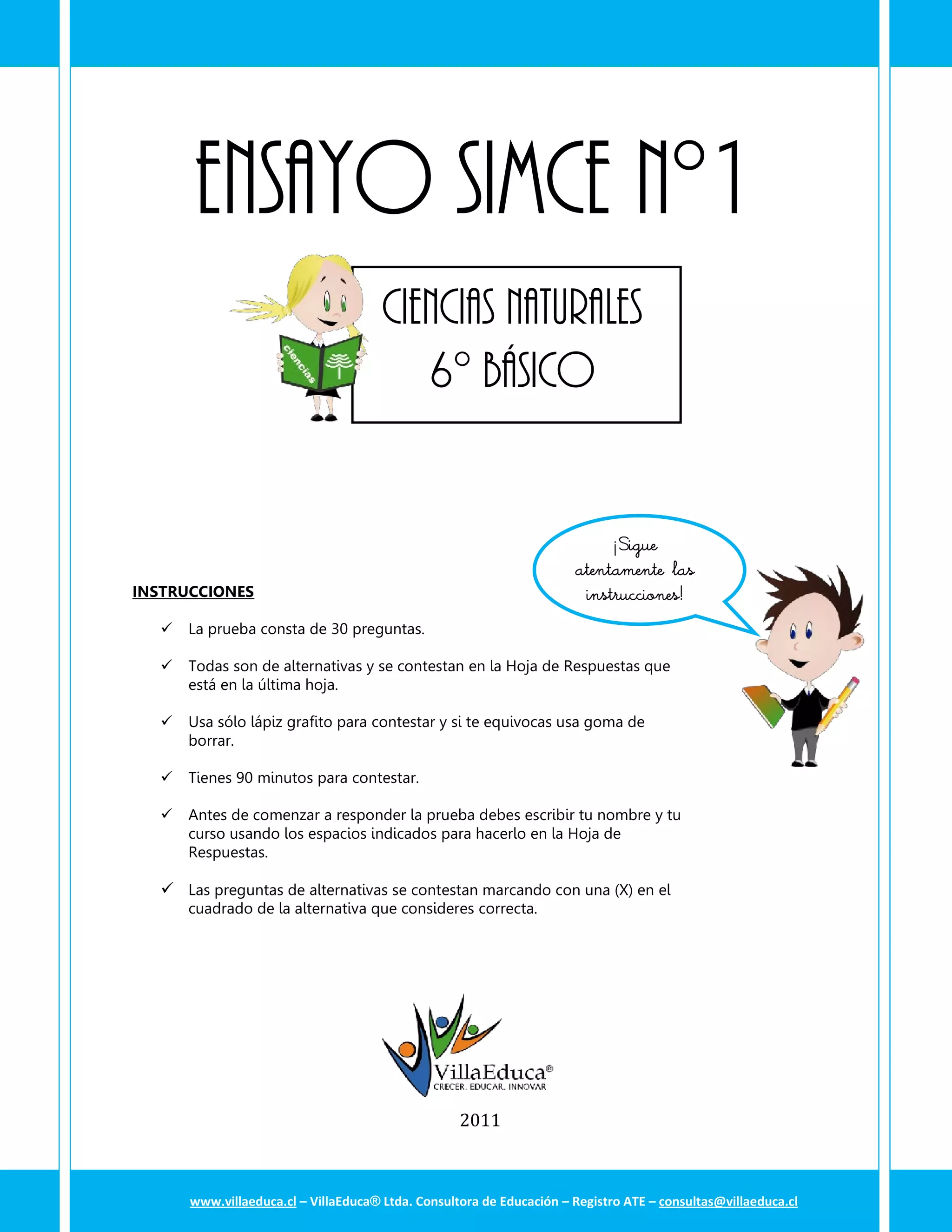 Este documento presenta las instrucciones para un examen SIMCE de Ciencias Naturales para 6o básico. Indica que la prueba consta de 30 preguntas de alternativas múltiples, que deben responderse en la hoja de respuestas adjunta. Los estudiantes tienen 90 minutos para completarla y deben seguir las instrucciones indicadas.