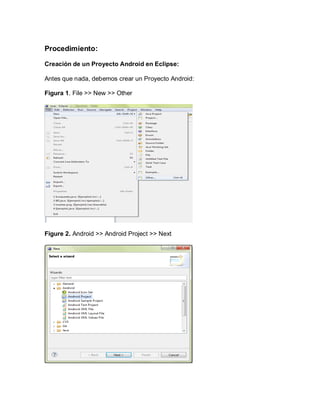Este documento describe cómo crear una base de datos SQLite en una aplicación Android utilizando Eclipse. Explica el proceso de creación de un proyecto Android en Eclipse, el diseño de la interfaz gráfica con XML y el desarrollo de clases para dar funcionalidad a la aplicación e integrar la base de datos.