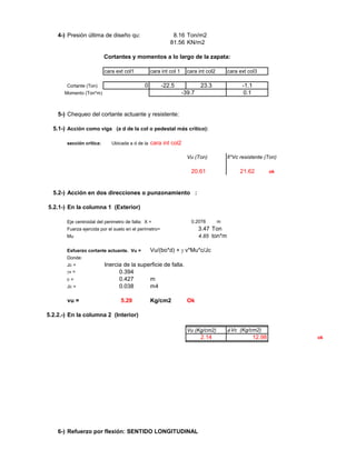 Este documento proporciona los detalles de diseño de cimentación para dos columnas. Incluye las dimensiones, cargas, materiales, presiones admisibles del suelo, geometría requerida de la zapata combinada, chequeo de cortantes y momentos, y refuerzo longitudinal y transversal. El diseño resulta en una zapata rectangular de 7.2m x 1.29m con refuerzo distribuido.