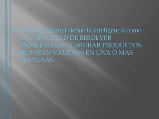 El documento resume la teoría de las inteligencias múltiples de Howard Gardner, la cual propone que la inteligencia no se limita a una capacidad académica sino que existen múltiples tipos de inteligencia como la espacial, musical, corporal, interpersonal e intrapersonal. Gardner define la inteligencia como la capacidad de resolver problemas o crear productos valiosos para una cultura.