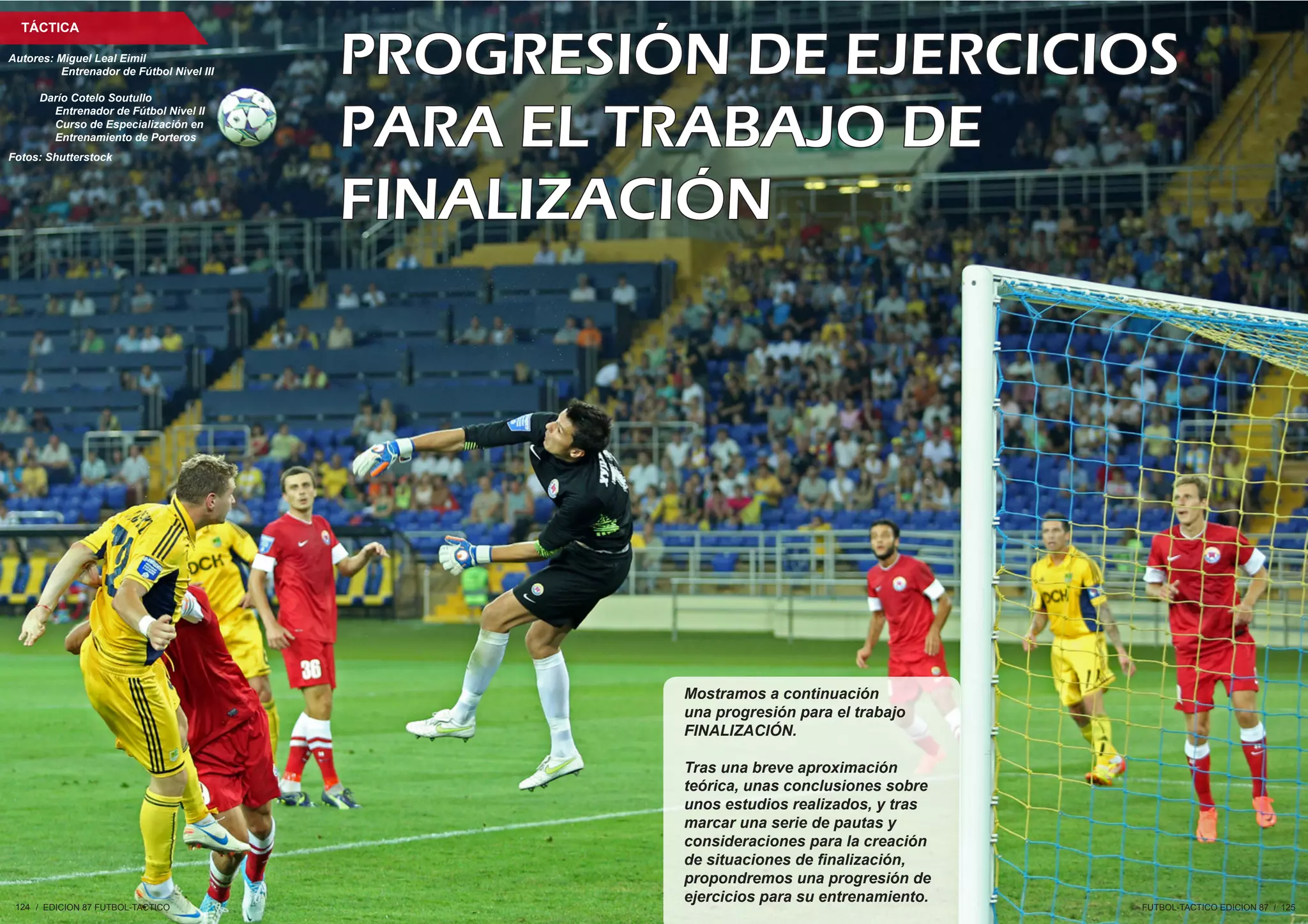Este documento presenta una progresión de ejercicios para entrenar la finalización en fútbol. Comienza con una breve introducción teórica y los resultados de estudios sobre cómo se marcan los goles. Luego propone seis ejercicios que comienzan sencillos, involucrando paredes y tercer hombre, y terminan más complejos como partidos modificados para crear oportunidades de finalización. El objetivo es mejorar la habilidad de los jugadores para anotar goles en diferentes situaciones cercanas al arco a través de la
