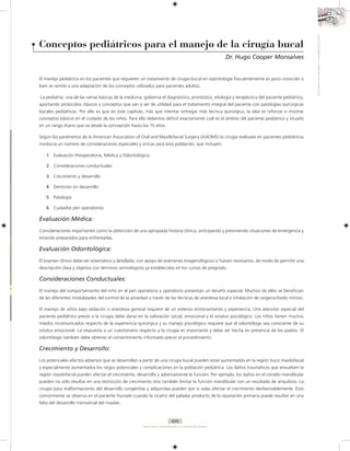Este documento describe varios conceptos importantes para la cirugía bucal en pacientes pediátricos. Explica que la cirugía bucal en niños requiere consideraciones especiales como la evaluación médica y odontológica del paciente, factores conductuales, el crecimiento y desarrollo dental en curso, y los cuidados posteriores a la cirugía. También discute temas como el manejo de infecciones odontogénicas, la extracción de dientes primarios y permanentes, y cómo la patología y dentición en desarrol
