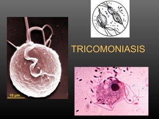 La tricomoniasis es una infección de transmisión sexual causada por el protozoo Trichomonas vaginalis. Puede causar síntomas como flujo vaginal anormal, picazón o ardor en la vulva y vagina en mujeres, y flujo y ardor al orinar en hombres. El diagnóstico se realiza mediante examen microscópico del flujo vaginal o pruebas de laboratorio. El tratamiento consiste en medicamentos como metronidazol. Es importante tratar a ambos miembros de la pareja para evitar reinfecciones.