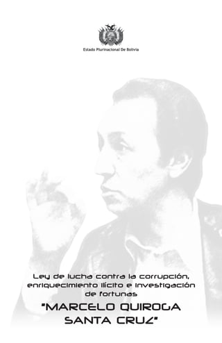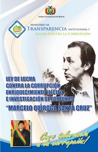 Este documento presenta la Ley de Lucha contra la Corrupción, Enriquecimiento Ilícito e Investigación de Fortunas "Marcelo Quiroga Santa Cruz" del Estado Plurinacional de Bolivia. La ley establece mecanismos y procedimientos para prevenir, investigar y sancionar actos de corrupción. Crear el Consejo Nacional de Lucha contra la Corrupción y entidades como tribunales y fiscalías especializadas en delitos de corrupción. Además, protege a denunciantes y testigos en casos de corrupción.