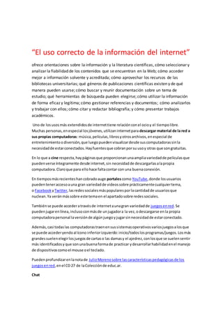 Este documento ofrece orientaciones sobre el uso correcto de la información en Internet, incluyendo cómo seleccionar fuentes fiables, acceder a información acreditada, usar herramientas de búsqueda, citar y presentar trabajos académicos. También describe algunos usos comunes de Internet como el ocio, redes sociales, juegos en línea y mensajería instantánea. Finalmente, explica que Internet es la principal fuente de información mundial y cómo acceder noticias y archivos a través de protocolos como FTP.