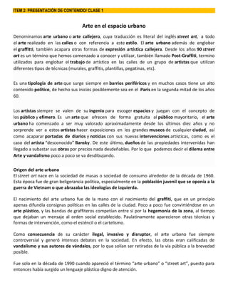 Este documento presenta una guía de aprendizaje sobre arte urbano para estudiantes de 8° básico. Incluye instrucciones, objetivos de aprendizaje, actividades como definir diferencias entre obras de arte, analizar imágenes y crear su propia obra inspirada en artistas. También presenta información sobre el origen y evolución del arte urbano, así como sobre los artistas Keith Haring y Banksy. El documento evalúa el aprendizaje de los estudiantes y su participación en clases remotas.
