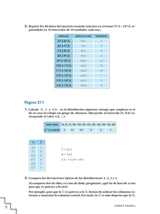 Este documento presenta varios ejercicios y problemas relacionados con conceptos estadísticos como intervalos, tablas de frecuencias, medidas de tendencia central, medidas de dispersión y diagramas. Se piden calcular parámetros como media, mediana, cuartiles, desviación típica y coeficiente de variación para diferentes conjuntos de datos. También se solicita construir histogramas, polígonos de frecuencias y diagramas de caja para representar gráficamente las distribuciones.