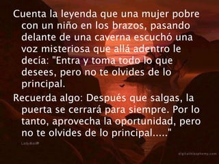 La historia cuenta de una mujer pobre que entra a una cueva mágica donde puede tomar todas las riquezas que desee, pero solo tiene ocho minutos. Fascinada por el oro, olvida a su hijo en el suelo y sale cargada de tesoros una vez terminado el tiempo. Al cerrarse la puerta para siempre, se da cuenta que dejó a su hijo adentro en pos de las riquezas materiales. El cuento enseña que en la vida solo tenemos unos 80 años y debemos enfocarnos en lo espiritual y las relaciones, no en lo material