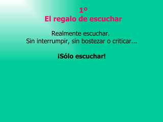 El documento proporciona 8 regalos que no cuestan dinero que se pueden dar a amigos y familiares. Estos incluyen escuchar activamente, mostrar afecto físico, sonreír, escribir notas de agradecimiento, dar cumplidos sinceros, hacer favores, pasar tiempo a solas cuando se necesita, y expresar gratitud. El mensaje principal es que los regalos más significativos a menudo no cuestan dinero y en su lugar involucran el tiempo y la atención de una persona.