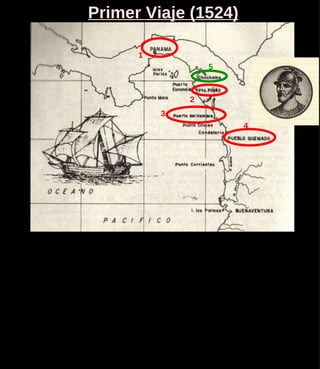El documento describe la conquista del Perú por parte de los españoles liderados por Francisco Pizarro entre 1524 y 1531. Resume los tres viajes de Pizarro y sus socios Hernando de Luque y Diego de Almagro para explorar la región y establecer colonias, culminando en la captura del líder inca Atahualpa y la fundación de las primeras ciudades españolas en el Tahuantinsuyo.