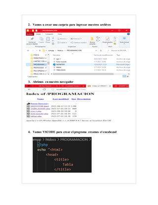El documento describe un informe sobre el uso de tablas en XAMPP. El objetivo era crear una tabla con fecha de nacimiento y número de celular. Se utilizó XAMPP para ejecutar el servidor local y Visual Studio Code para crear el programa y las columnas y filas con los datos requeridos. Finalmente, se visualizó el programa terminado.