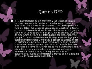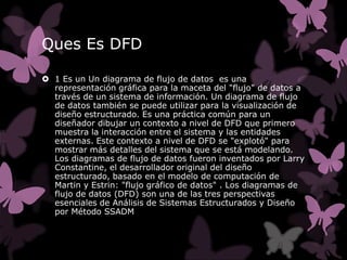 El documento describe los diagramas de flujo de datos (DFD), que son representaciones gráficas del flujo de datos a través de un sistema. Los DFD muestran cómo interactúan los sistemas con entidades externas y se utilizan para visualizar y diseñar sistemas de manera estructurada. También describe los símbolos normalizados utilizados en los DFD y cómo representan conceptos como entrada, salida, procesamiento y almacenamiento de datos.