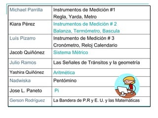 Este documento presenta una lista de 14 estudiantes y los temas de matemáticas en los que cada uno se especializará para integrarlos a la tecnología educativa, incluyendo figuras geométricas como pirámides, prismas, poliedros, esferas y conos; instrumentos de medición como reglas, balanzas y cronómetros; y conceptos como sistema métrico, logaritmos y series.