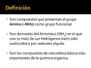 Las aminas son compuestos orgánicos que contienen el grupo funcional amino. Juegan un papel importante en procesos bioquímicos como aminoácidos y proteínas. Las aminas pueden ser primarias, secundarias o terciarias dependiendo del número de sustituyentes unidos al nitrógeno, y se clasifican también por el número de grupos amino presentes.