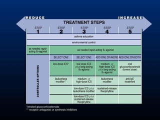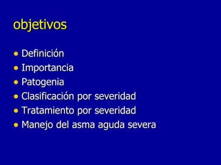 Este documento resume la definición, mecanismos, importancia y tratamiento del asma bronquial. Define el asma como una enfermedad inflamatoria crónica de las vías respiratorias que causa episodios recurrentes de sibilancias y tos. Explica los factores de riesgo, la patogénesis y los mecanismos celulares involucrados. También describe la variación mundial de la prevalencia del asma, su importancia como una de las enfermedades crónicas más comunes y los factores asociados con el fracaso