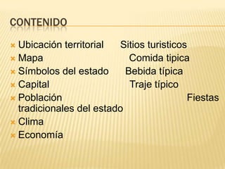 Este documento proporciona información básica sobre el estado de Sucre en Venezuela. Ubicado en la región nororiental del país, limita con el Mar Caribe y otros estados. Algunos de sus símbolos incluyen la bandera y árbol emblemático. La capital es Cumaná y la población es de aproximadamente 824,764 habitantes. La economía se basa en la agricultura, la pesca y la explotación salinera. Entre los sitios turísticos destacados se encuentra el Parque Nacional Mochima y las fiestas tra