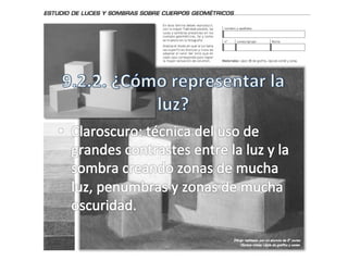 Este documento describe las cualidades de la luz y las técnicas para representar el claro-oscuro en el dibujo. Explica que la luz puede ser natural o artificial y define zonas como la luz propia, media luz, sombra propia y sombra proyectada. Además, detalla técnicas como el sombreado o rayado y la mancha para representar el volumen mediante distintos valores tonales en el claroscuro.