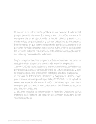 La ley chilena garantiza el acceso a la información pública a través de tres mecanismos: 1) La Ley de Acceso a la Información Pública, que regula la transparencia de la función pública y abre la información de los organismos estatales a la ciudadanía; 2) Las Oficinas de Información, Reclamos y Sugerencias (OIRS), que son espacios de interacción entre ciudadanos y servicios públicos; 3) El Sistema Integral de Información y Atención Ciudadana, que coordina los espacios de atención ciudad