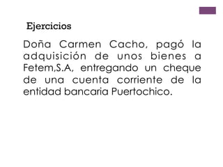 El documento contiene varios ejercicios y preguntas sobre cheques bancarios. Se pide identificar roles como librador, librado, tomador y avalista en diferentes situaciones de pago con cheques. También se incluyen preguntas sobre la diferencia entre importes escritos, cheques nominativos frente a al portador, el proceso de endoso y aval, y qué sucede cuando un cheque no puede ser pagado por falta de fondos.