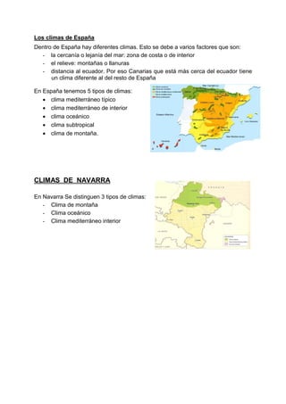 El documento describe los diferentes climas de España y Navarra. Existen cinco tipos de climas en España: mediterráneo típico, mediterráneo de interior, oceánico, subtropical y de montaña. Navarra tiene tres climas principales: de montaña en el norte, oceánico en los valles del norte debido a la cercanía del mar Cantábrico, y mediterráneo de interior en la Ribera y parte de la Navarra media.