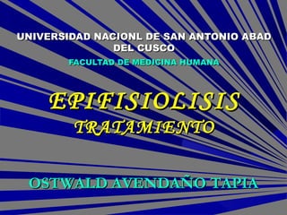 Este documento trata sobre la epifisiolisis. Brevemente: 1) La epifisiolisis es la fractura del cartílago de crecimiento que ocurre comúnmente en adolescentes y puede causar deformidades óseas y alteraciones del crecimiento; 2) Existen varios tipos de epifisiolisis clasificados por Salter-Harris dependiendo de la localización y extensión de la fractura; 3) La epifisiolisis de cadera específicamente puede causar coxa vara u otras deformidades de la cadera y afectar la marcha.