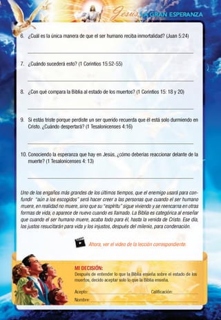 El documento aborda la perspectiva bíblica sobre la muerte y el estado de los muertos, enfatizando que solo Jesús es inmortal y que al morir, el ser humano deja de existir hasta la resurrección. Se plantea la esperanza de reunirse con los seres queridos en Cristo, y se rechaza la idea de la reencarnación o supervivencia del espíritu. Finalmente, se hace un llamado a aceptar la enseñanza bíblica sobre la muerte y resurrección.