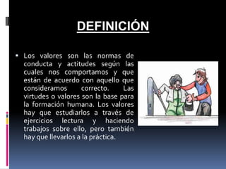 Este documento define y clasifica los valores morales. Explica que los valores son normas de conducta que guían el comportamiento humano y se basan en lo que consideramos correcto. Los valores morales surgen principalmente en la familia e incluyen el respeto, la honestidad, la responsabilidad y la tolerancia. También distingue entre valores morales, de ética y sociales, y describe las características e importancia de los valores para las personas y la sociedad.