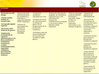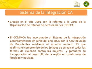 Este documento resume la presentación de Miosotis Rivas Peña sobre la institucionalización de la igualdad de género en el Sistema de Integración Centroamericana (SICA). El SICA incorporó al Consejo de Ministras de la Mujer de Centroamérica en 2005 para promover la igualdad de género. El documento describe las funciones del Consejo y sus esfuerzos para transversalizar la perspectiva de género en el SICA a través de su Plan Estratégico 2009-2013 y otros mecanismos. También