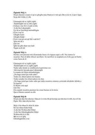 Ifá le aconseja a esta persona que ofrezca sacrificios a su Orí preparando 201 pasteles de frijol y reuniendo personas. Si hace esto, las cosas buenas vendrán a su casa. La historia también habla de Orí, quien consulta a los babalawos y recibe el consejo de aventurarse como sacerdote en la casa de un hombre rico.