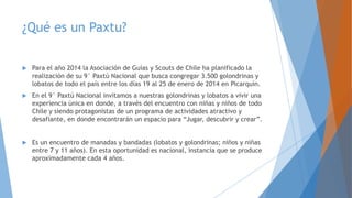 El documento describe el 9o Paxtu Nacional, un evento organizado por la Asociación de Guías y Scouts de Chile que reunirá a 3,500 niños entre 7 y 11 años de todo el país. Se llevará a cabo entre el 19 y 26 de enero de 2014 en la Hacienda Picarquín ubicada en la Región del Libertador Bernardo O'Higgins. El programa incluirá módulos sobre granja, deportes, feria, medio ambiente y más. Los participantes se dividirán en 14 subcampos y realizarán actividades recreativas y de apre