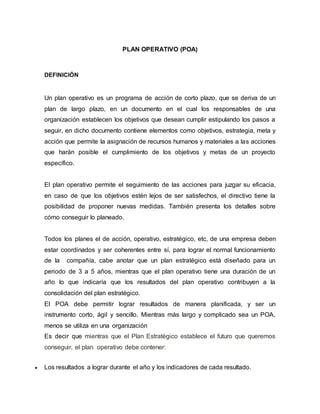 El documento presenta un plan operativo anual (POA) elaborado por Gustavo González y otros miembros para la gestión administrativa. Explica que un POA es un programa de corto plazo para alcanzar los objetivos de un plan estratégico de largo plazo, asignando recursos y acciones específicas. Detalla los componentes clave de un POA como objetivos, actividades, responsables, recursos y cronograma, y la importancia de realizar seguimiento periódico para asegurar el cumplimiento de las metas planificadas.