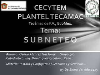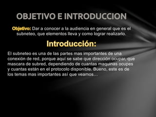 El documento explica cómo realizar el subneteo dividiendo una red grande en subredes más pequeñas. Define el subneteo como el acto de dividir redes para que funcionen mejor al enviar y recibir paquetes a través de Internet. Describe los pasos para crear una tabla de subneteo incluyendo la subred, número de PCs, máscara de subred, rango, direcciones utilizables y gateway. Explica cómo calcular estos valores para configurar correctamente el subneteo.