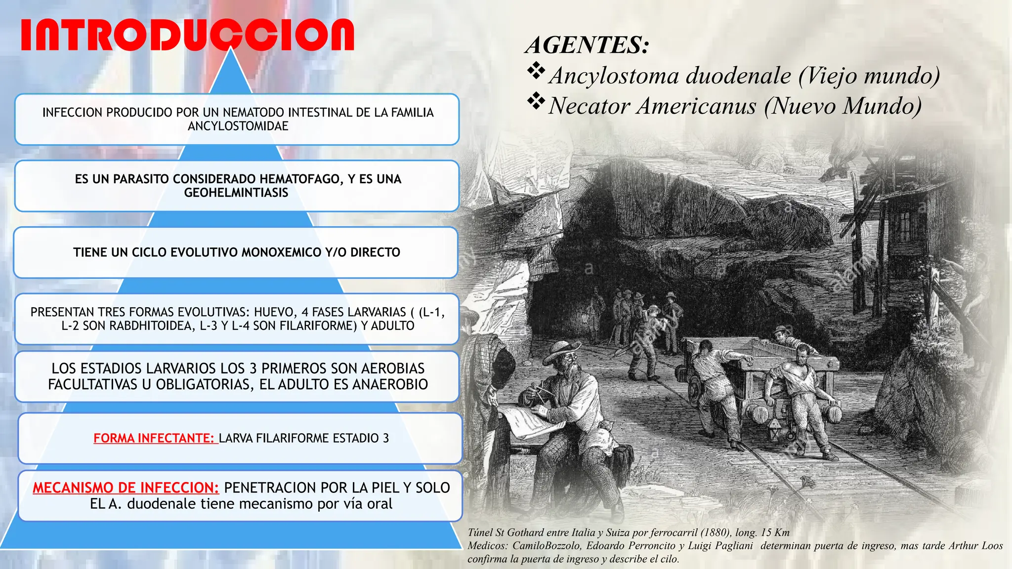 El documento describe la infección causada por nematodos intestinales de la familia Ancylostomidae, que son parásitos hematófagos con un ciclo evolutivo directo y varias fases larvarias. Se destacan las características de dos especies principales: Ancylostoma duodenale y Necator americanus, así como su mecanismo de infección a través de la piel. Además, se detalla el ciclo de vida de estos parásitos, que incluye la migración desde la piel a los pulmones y finalmente al intestino delgado.