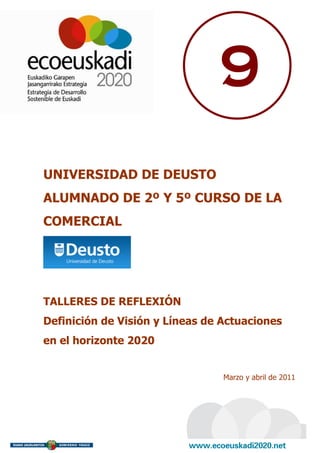 Este documento resume los resultados de tres talleres de reflexión sobre sostenibilidad realizados con alumnos de segundo curso de la Universidad de Deusto. Participaron cerca de 200 alumnos divididos en equipos, quienes analizaron casos de empresas y propusieron líneas de acción en áreas como recursos naturales, energía, movilidad y globalización. Los estudiantes generaron 67 propuestas que fueron valoradas positivamente. El proceso buscaba sensibilizar a los jóvenes sobre el futuro sostenible y recoger sus ideas.