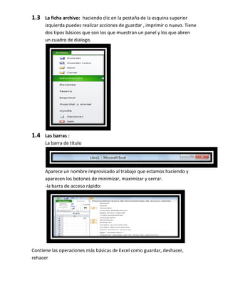 Este documento presenta una introducción al programa Excel, incluyendo cómo iniciarlo, navegar por la interfaz principal, y realizar tareas básicas como introducir y modificar datos, así como operaciones con archivos como guardar, abrir y cerrar libros de trabajo.