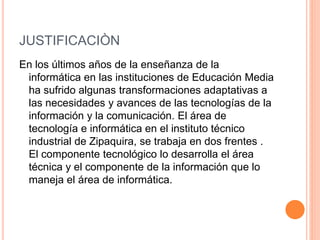 El documento describe el área de tecnología e informática en el Instituto Técnico Industrial de Zipaquira. El área se divide en dos componentes: el técnico manejado por el área técnica, y el de información manejado por informática. Los objetivos generales son servir de apoyo a otras áreas y desarrollar habilidades para el uso de tecnologías de información. Los objetivos específicos incluyen desarrollar destrezas en procesamiento de texto, hojas de cálculo, presentaciones, animaciones, programación, herramient