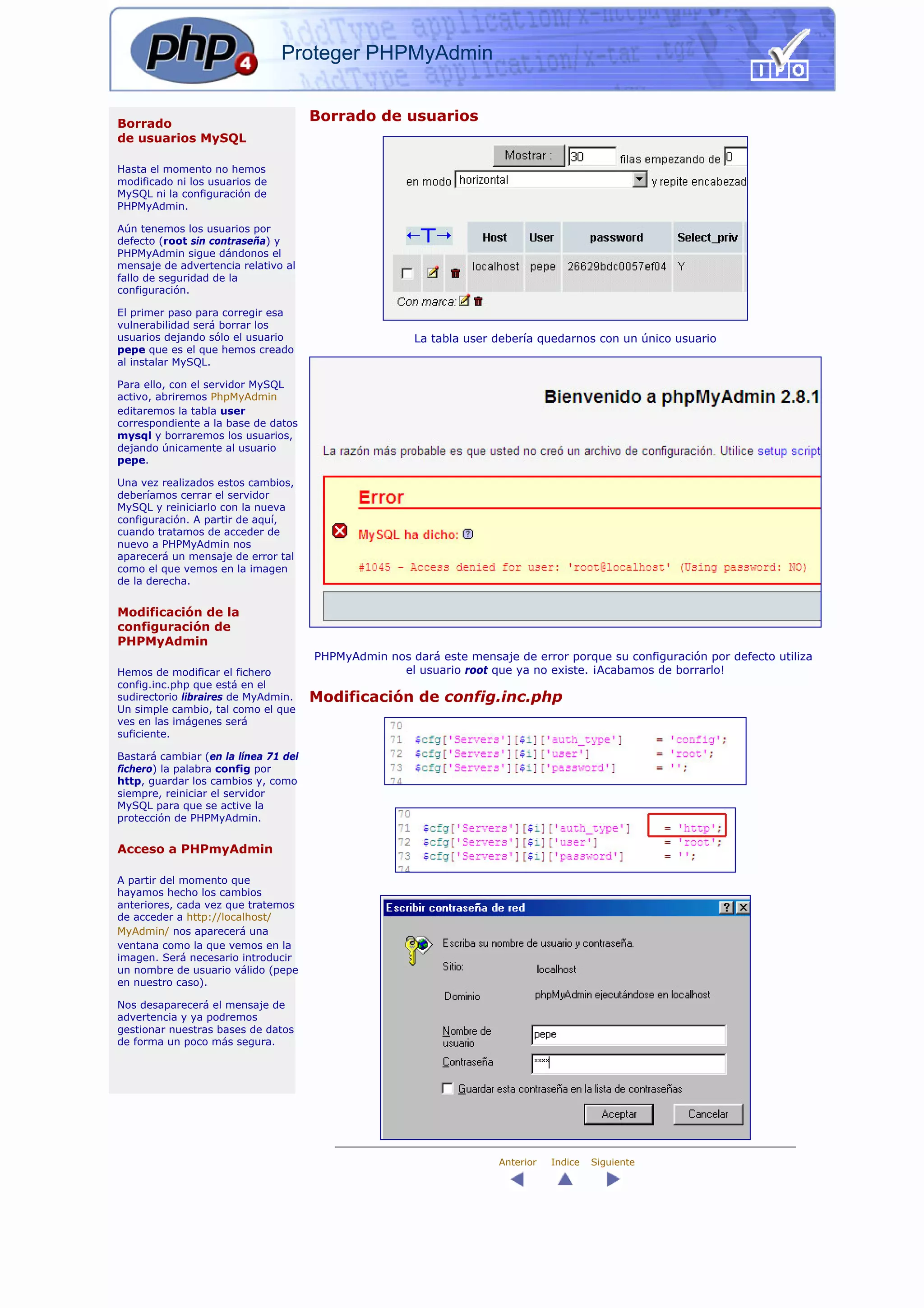 Este documento describe los pasos para proteger PHPMyAdmin borrando los usuarios predeterminados de MySQL y modificando la configuración de PHPMyAdmin para que utilice un usuario válido en lugar del usuario root predeterminado. Primero, se borran todos los usuarios de MySQL excepto uno creado durante la instalación. Luego, se modifica el archivo de configuración de PHPMyAdmin para que utilice el nuevo usuario en lugar de root. Ahora, cuando se accede a PHPMyAdmin se solicitará introducir las credenciales de usuario.