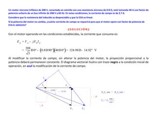 El documento presenta dos problemas relacionados con motores síncronos. El primer problema involucra un motor síncrono trifásico de 208V que opera inicialmente con un factor de potencia de 1 y una corriente de campo de 2.7A. Se pide calcular la nueva corriente de campo requerida para operar con un factor de potencia de 0.8 en adelanto manteniendo la misma potencia. El segundo problema involucra un motor síncrono de 1000hp, 2300V que opera con un ángulo de potencia de 15° y se pide calcular su factor de
