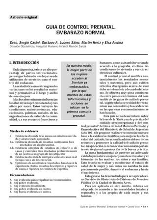 Este documento presenta una guía para el control prenatal de embarazos normales. La guía proporciona recomendaciones sobre el cuidado preconcepcional, el control prenatal temprano y periódico, y establece objetivos como prevenir complicaciones, vigilar el crecimiento fetal y detectar enfermedades. La guía también cubre temas como la suplementación con ácido fólico, la detección de factores de riesgo, y un cronograma propuesto de controles prenatales adaptado a la situación socioeconómica en Argentina.