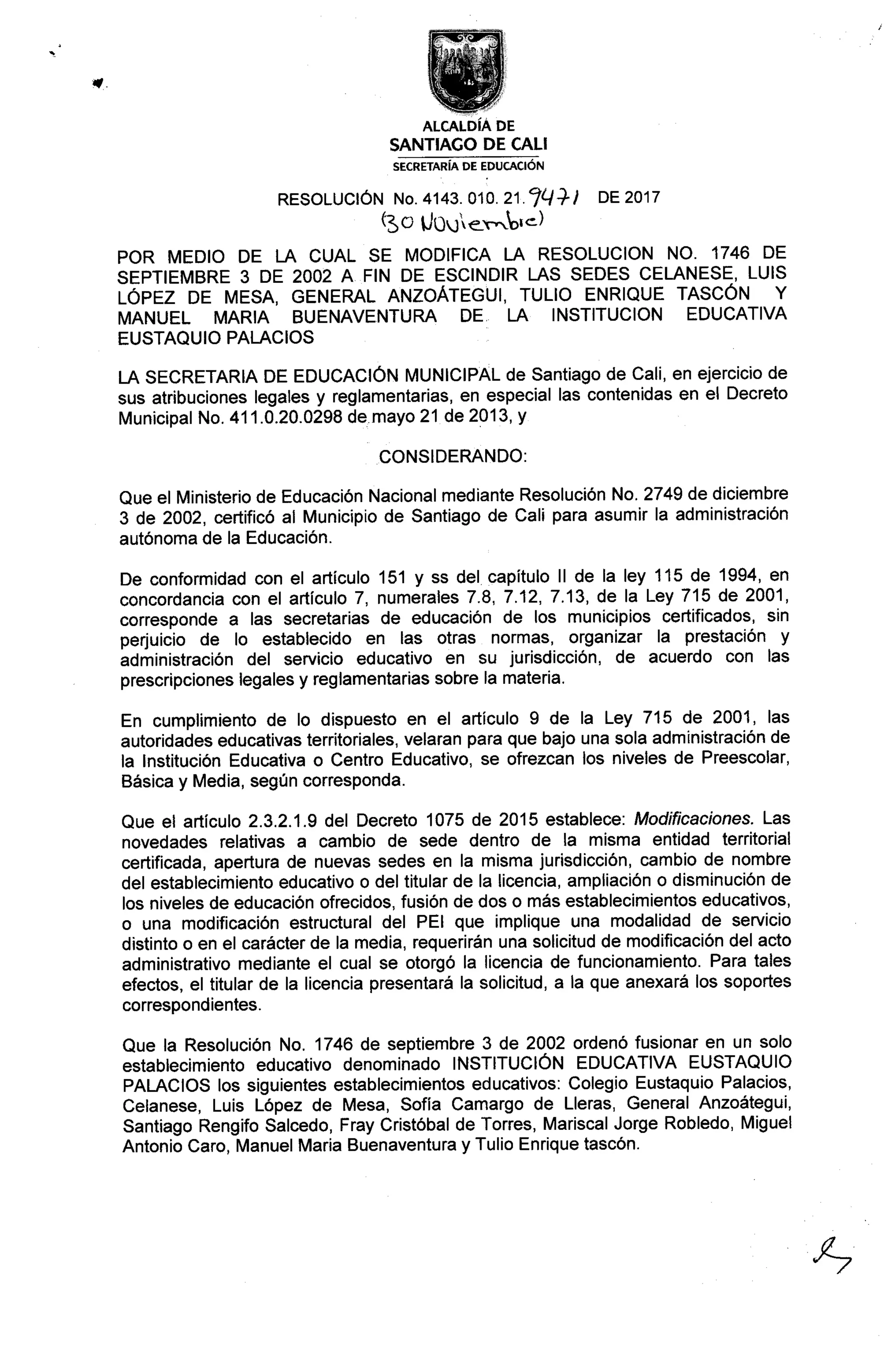La resolución modifica una resolución anterior para escindir cinco sedes (Celanese, Luis López de Mesa, General Anzoátegui, Tulio Enrique Tascón y Manuel María Buenaventura) de la Institución Educativa Eustaquio Palacios. Esto con el fin de garantizar una prestación de servicio educativo más eficiente. Las sedes escindidas pasarán a constituir nuevas instituciones educativas de manera independiente.