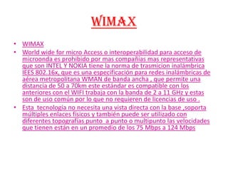 El documento trata sobre diferentes temas relacionados con las redes inalámbricas y de área amplia. Explica los estándares WiFi 802.11a, 802.11b, 802.11g y el esperado 802.11n, así como las normas WiMAX 802.16x. También habla sobre la necesidad de sistemas operativos de red para compartir recursos entre equipos, y sobre conceptos básicos de seguridad en redes como amenazas, información e informar. Por último, define los cortafuegos como sistemas para separ