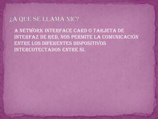 Una tarjeta de interfaz de red (NIC) permite la comunicación entre dispositivos conectados a una red. Existen diferentes tipos de conectividad como Ethernet, que usa cables RJ-45, y WiFi, que usa señales inalámbricas. Cada tipo tiene ventajas y desventajas respecto a la velocidad, alcance y movilidad. Otros estándares como Bluetooth e IrDA también permiten la transmisión inalámbrica de datos a corta distancia.