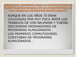 El documento describe la arquitectura de Von Neumann para la construcción de computadoras basada en programas almacenados. Explica que aunque esta arquitectura se usaba poco en los años 70, las ideas de Von Neumann y Turing describían ordenadores con este diseño. También indica algunas características a considerar en procesadores AMD e Intel, como nuevos enlaces de alta velocidad en AMD que reducen el calor y consumo, y tecnología en Intel que permite mayores velocidades de reloj y menos calor generado.
