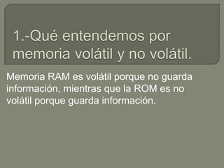 La memoria RAM es volátil porque pierde la información al apagarse, mientras que la ROM es no volátil y guarda información de forma permanente. La RAM permite el acceso aleatorio a la información, mientras que la ROM almacena de forma permanente instrucciones y datos. La RAM es un tipo de memoria de semiconductor que permite tanto la lectura como la escritura de información.