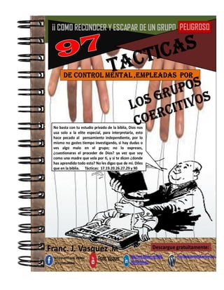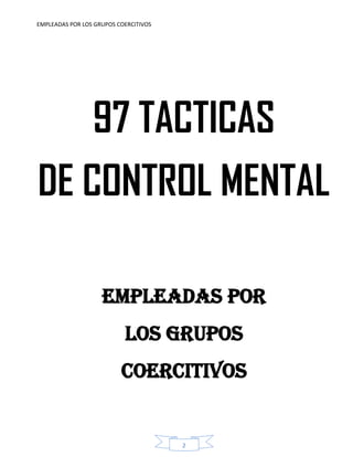 Este documento presenta un resumen de 97 tácticas de control mental empleadas por grupos coercitivos. Comienza con una breve reseña histórica del control mental desde la primera familia en el Edén hasta el mesmerismo. Luego describe casos modernos donde grupos han causado tragedias usando estas tácticas. Más adelante define términos como control mental, lavado de cerebro, coerción y coacción. Finalmente, el documento se enfoca en describir las 97 tácticas específicas de manipulación usadas por estos grupos.