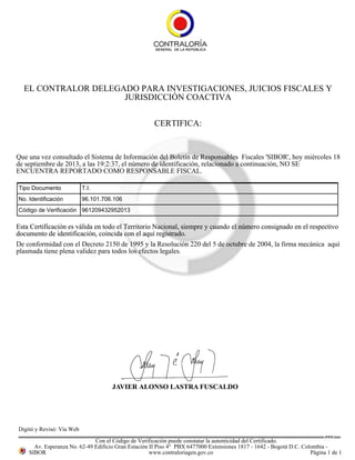 Este documento es una certificación de que el número de identificación 96.101.706.106 no se encuentra reportado como responsable fiscal en el Sistema de Información del Boletín de Responsables Fiscales. La certificación es válida en todo el territorio nacional siempre que el número de identificación coincida con el registrado. El documento fue emitido por el Contralor Delegado para Investigaciones, Juicios Fiscales y Jurisdicción Coactiva.