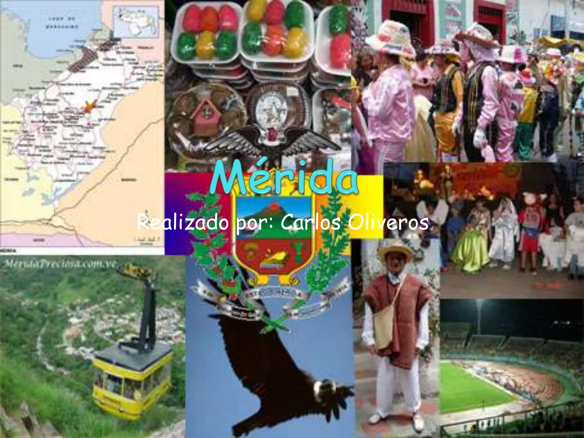El documento proporciona información sobre el estado Mérida en Venezuela. Ubicado en la región andina, Mérida limita con los estados de Trujillo, Zulia, Barinas y Táchira. La capital y ciudad más grande es Mérida, que tiene una población de aproximadamente 935,000 habitantes. Algunos sitios y tradiciones notables incluyen la Plaza Monumental Román Eduardo Sandia, el plato típico pizca andina, la bebida calentaíto y las fiestas de la Cruz de Mayo y la Quema de