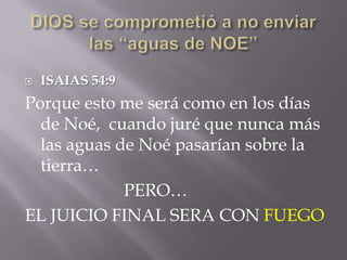 El documento resume las enseñanzas bíblicas sobre el Juicio Final. Según las Escrituras, Dios destruirá la tierra y los cielos con fuego en el Juicio Final para luego crear "Cielos nuevos y tierra nueva". Pedro enseña que el mundo será destruido con fuego, que la aparente demora de Dios se debe a su misericordia, y que el Señor vendrá como ladrón en la noche para juzgar a la humanidad. Exhorta a vivir santamente a la luz de estos acontec