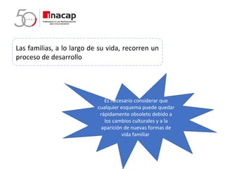 Este documento describe las diferentes etapas del ciclo vital de una familia según los análisis de Haley (1980) y Mc. Goldrick (1989). Identifica 7 etapas principales: 1) adulto joven independizado, 2) matrimonio recién establecido, 3) familia con hijos pequeños, 4) familia con hijos en edad escolar, 5) familia con hijos adolescentes, 6) emancipación de los hijos, y 7) últimas etapas como el retiro y la vejez. Cada etapa presenta cambios y desafíos